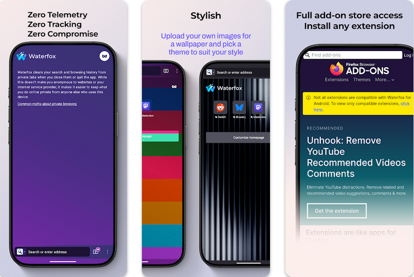 ) (accessible via Obtainium avec la source Github ou via le Play Store) - navigateur basé sur Firefox qui s’est engagé à n’inclure aucune IA (contrairement à Firefox), pas de télémétrie, pas de tracking. On peut y installer des extensions type uBlock.